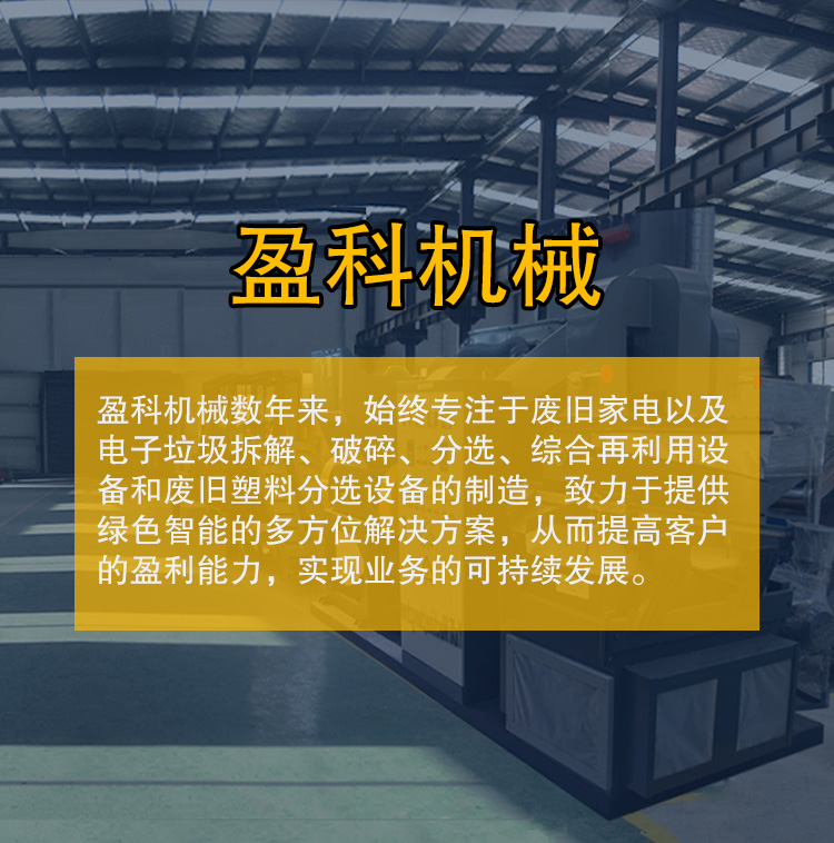 盈科机械数年来,始终专注于废旧家电以及电子垃圾拆解、破碎、分选、综合再利用设备和废旧塑料分选设备的制造,致力于提供绿色智能的多方位解决方案,从而提高客户的盈利能力,实现业务的可持续发展。